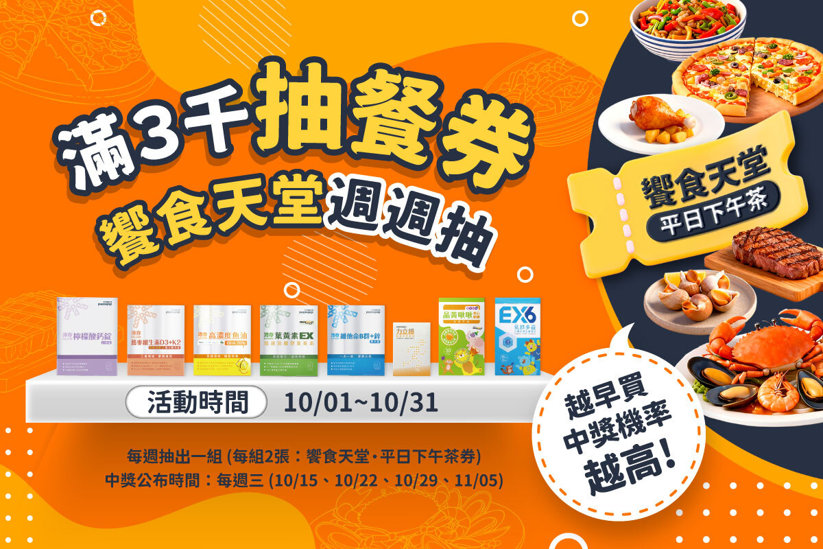 全館購物滿$3,000,即可參加抽獎活動,每週抽出1位幸運兒可獲得2張饗食天堂平日下午茶餐券,活動採累抽制,越早買中獎機會越高。