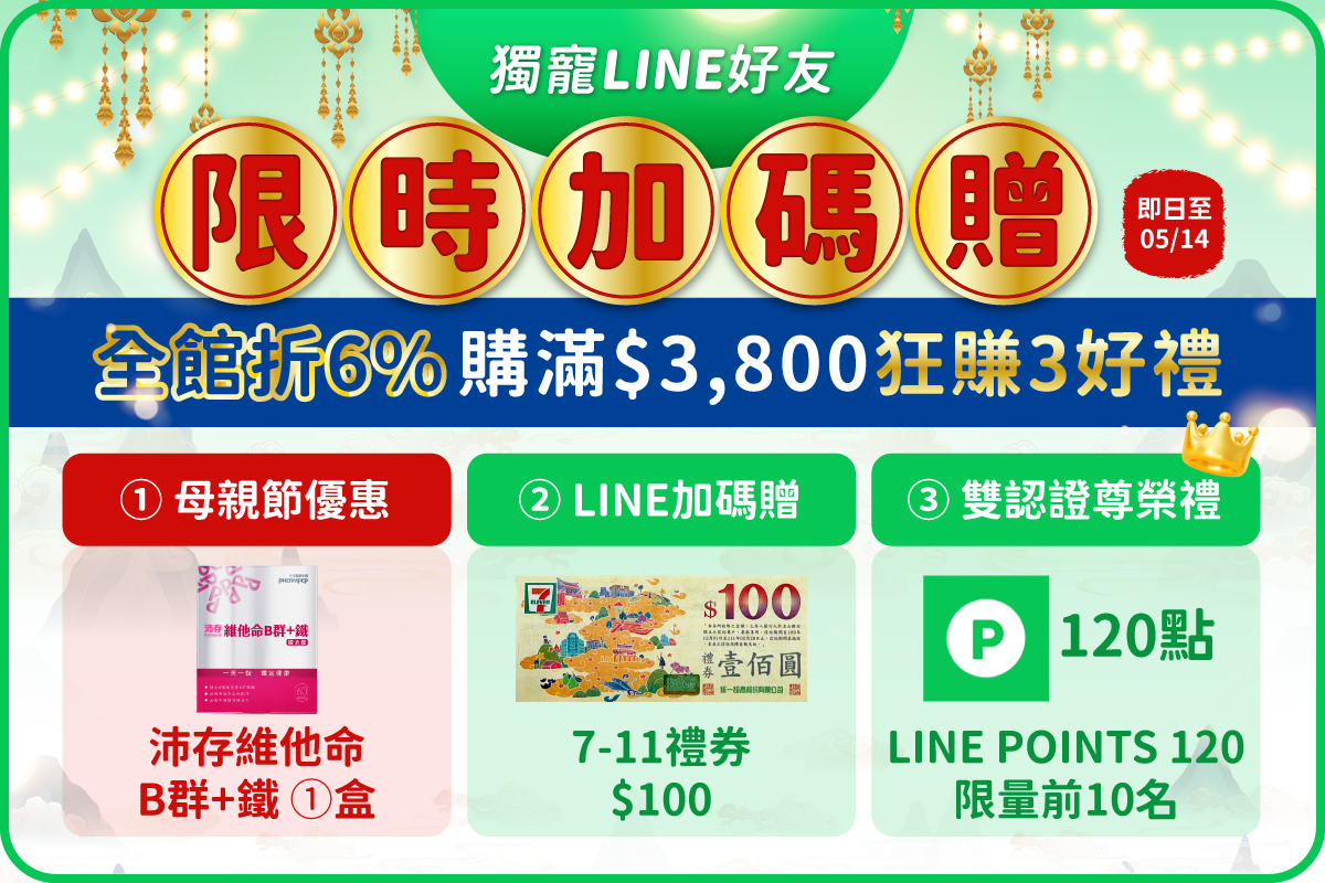 **如訂單及雙認證會員身份核對無誤,且無取消訂單、退貨之情事,【LINE POINTS 120點】將於2023/5/26派發,請勿封鎖中化健康生技官方LINE,以免無法領取獎點數。